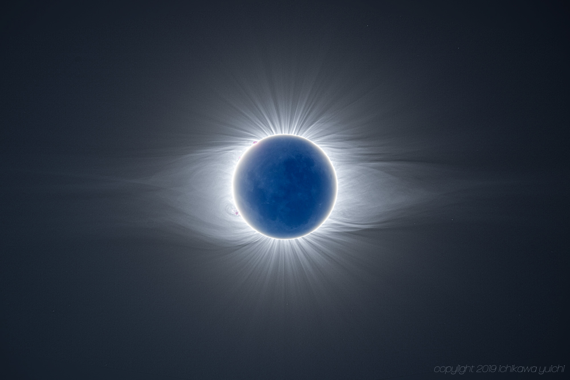 2019.07.02(皆既日食)Vicuña (CHILE)陸上での観測地はチリとアルゼンチンに限られた今回の皆既日食。過去の統計などからはアンデス山脈の東、アルゼンチン側のほうが晴天率がよかったが、本能的な感覚で観測地はチリに決定していた。チリへの道程は地球の裏側だけあってとても長い。日本からはまずANA便でアメリカのヒューストンまで12時間半のフライト。ここでUNITED便へ乗り換え、9時間ほどかけてチリのサンチアゴへ。そこからさらに国内線に乗り換えてLa Serena。途中ヒューストンでの乗り換え時間が12時間もあったため、日本を出てから目的地のLa Serenaまで約36時間という長旅だ。 La Serenaの空港で車を借りて早速観測地探し。海側のLa Serenaか山側のVicuñaあたりと考えていたけれど、Vicuñaから南へ10kmほど離れた山の上(標高1510m)に登ったときに、ここだ!と感じて観測地に決定。 皆既日食前日のVicuña (Chile)で見た天の川. - Spherical Image - RICOH THETA 前日の夜から観測地で過ごして南天の星空を満喫し、迎えた当日の朝は雲一つない快晴。抜群の空となった。 湿度が低い山岳地帯のため、第二接食が近づくにつれて気温の低下が明確にわかる。西の空で欠けていく太陽から視界を広げてみると、太陽に向かって左手、南の方から肉眼でもクッキリわかるほど濃い本影が迫ってくる。細く細くなった太陽の輝きが一段と増していき、グイグイと迫ってくる本影に包まれる刹那、ひときわまぶしく輝くダイヤモンドのきらめきを残して皆既日食に突入した。 典型的な極小期のコロナをまといつつも月縁に多くのプロミネンスが輝いている。ループを描く大きなプロミネンスとうねるようなコロナの流線。2分15秒という至福の時間だった。